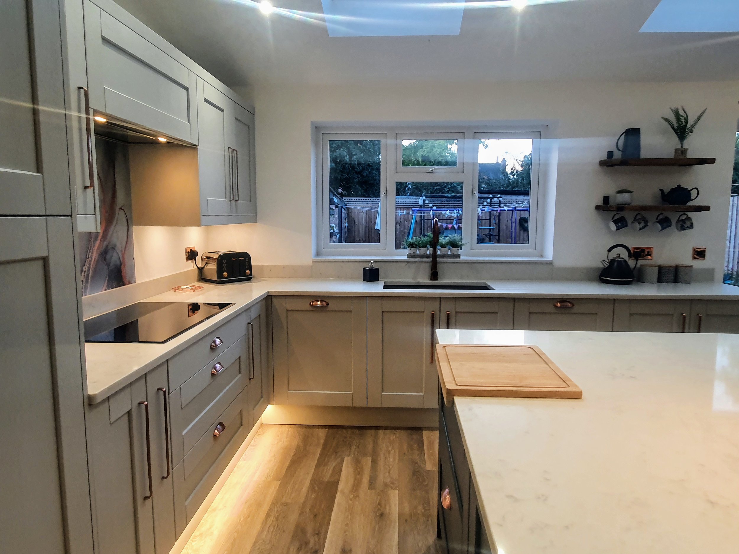 Collaborating with this wonderful customer to bring their vision of a sleek and sophisticated kitchen to life within their expansive extension was a truly fulfilling journey. The goal was to design a space that not only exuded elegance but also fostered togetherness and cherished family moments. To achieve this, we curated a refined palette of indigo and light grey cabinetry, complimented by copper accents and a white quartz worktop, which established a perfect harmony of calm and sophistication.